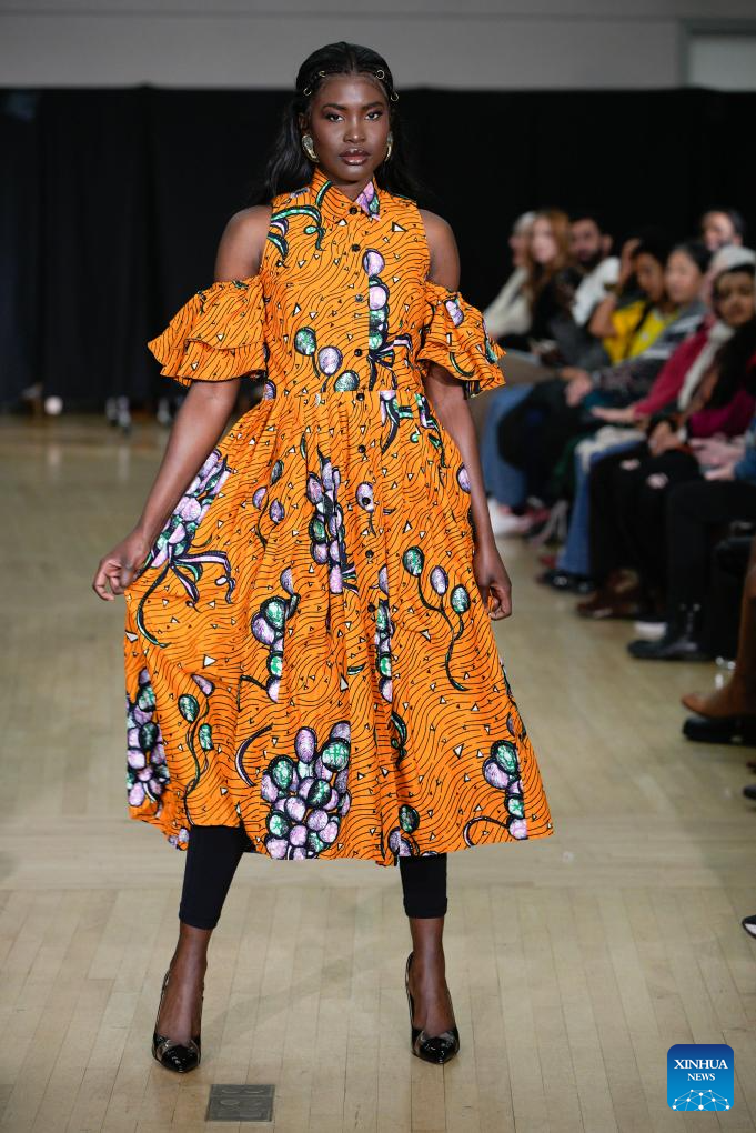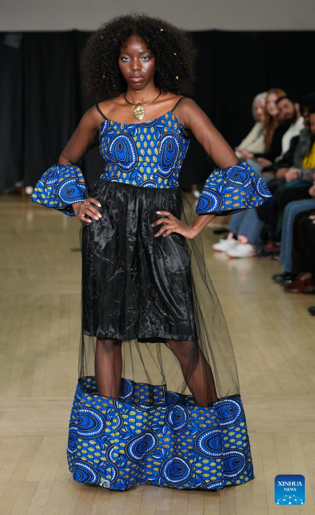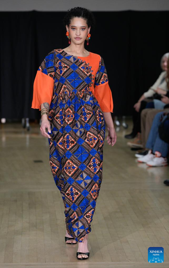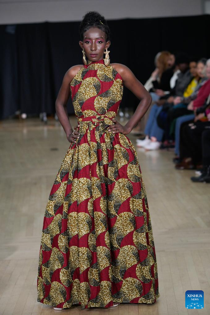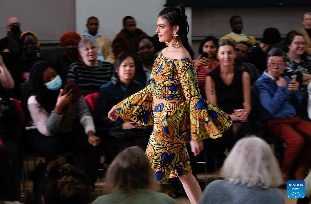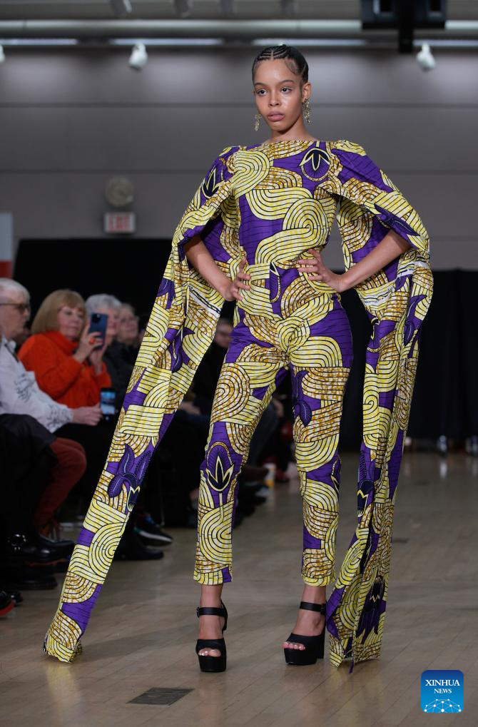 A model presents a creation during the "Heritage in Motion" fashion show in Vancouver, British Columbia, Canada, Feb. 15, 2025. (Photo by Liang Sen/Xinhua)