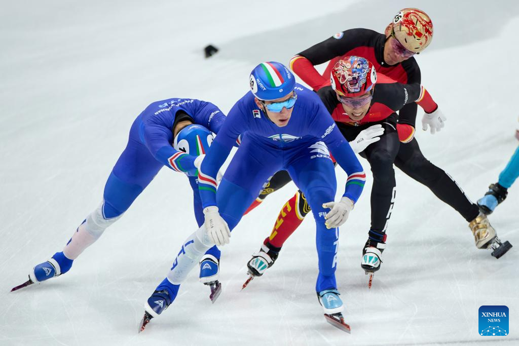 Skaters compete during the men's 5000m relay final A at the ISU Short Track World Tour 2024/2025 in Milan, Italy, Feb. 16, 2025. (Xinhua/Meng Dingbo)