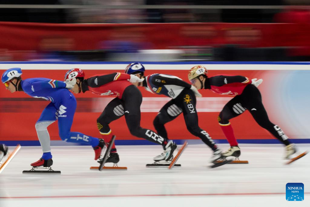 Sun Long of China competes during the men's 1000m final A at the ISU Short Track World Tour 2024/2025 in Milan, Italy, Feb. 16, 2025. (Xinhua/Meng Dingbo)