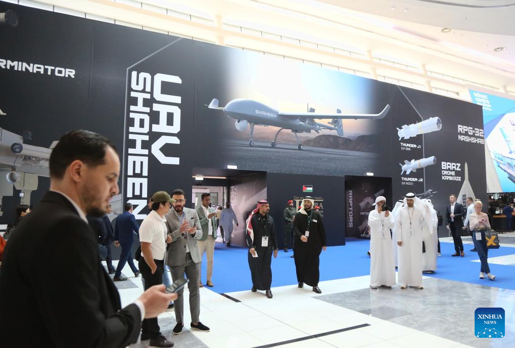 People visit the 2025 International Defense Exhibition and Conference in Abu Dhabi, the United Arab Emirates (UAE), Feb. 17, 2025. The ongoing 2025 International Defense Exhibition and Conference, alongside the Naval Defense and Maritime Security Exhibition, is held in the capital of the United Arab Emirates (UAE). The event attracted 1,565 defense companies from 65 countries to showcase the latest defense technologies and solutions aimed at promoting international peace and security, and will run until Feb. 21. (Xinhua/Wen Xinnian)