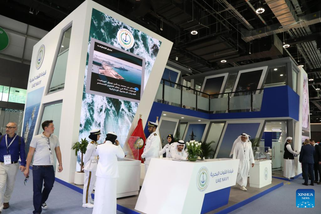 This photo taken on Feb. 17, 2025 shows the booth of the United Arab Emirates (UAE) navy at the 2025 International Defense Exhibition and Conference in Abu Dhabi, the UAE. The ongoing 2025 International Defense Exhibition and Conference, alongside the Naval Defense and Maritime Security Exhibition, is held in the capital of the United Arab Emirates (UAE).
