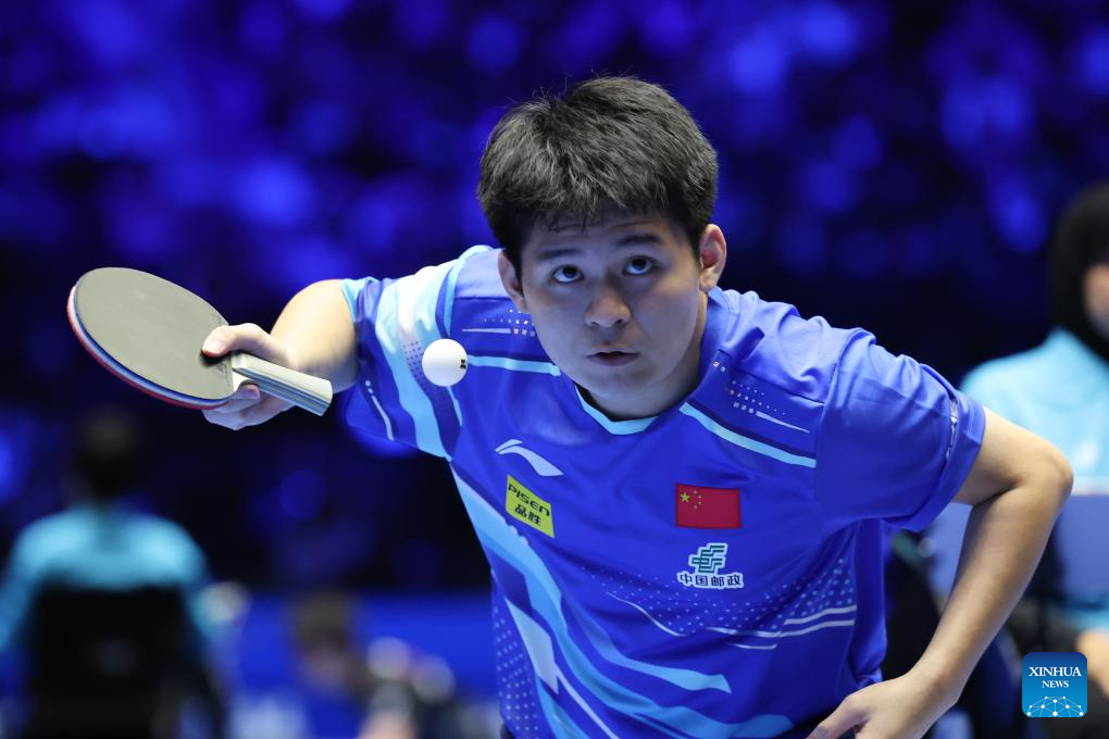 Lin Shidong of China serves during the men's singles Group 1 match against Wong Chun Ting of China's Hong Kong in Shenzhen, south China's Guangdong Province, Feb. 19, 2025. (Xinhua/Liang Xu)