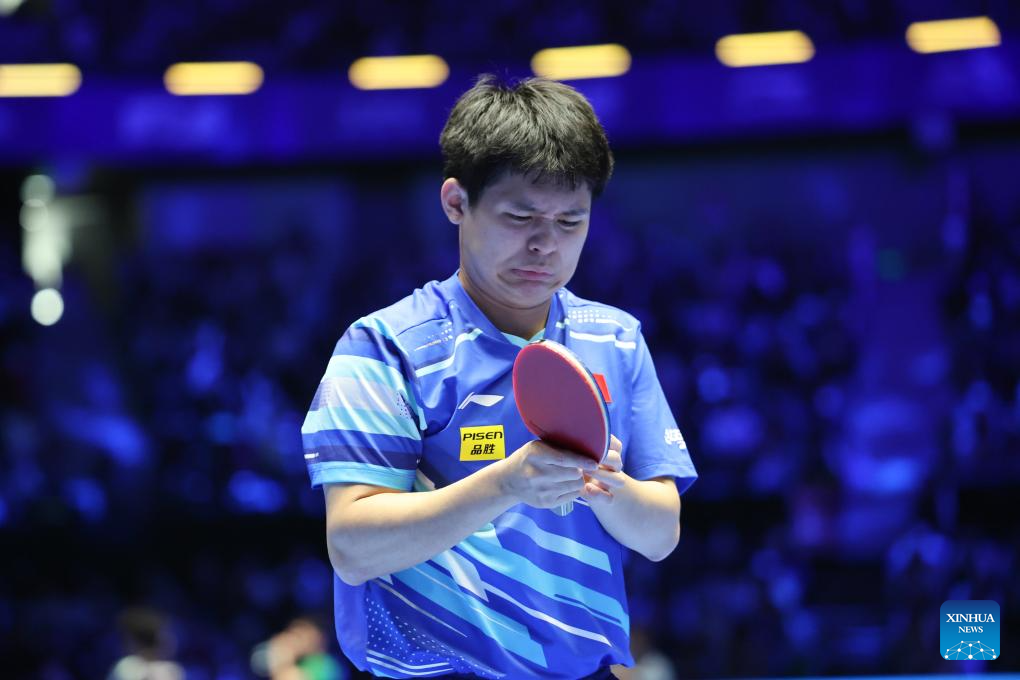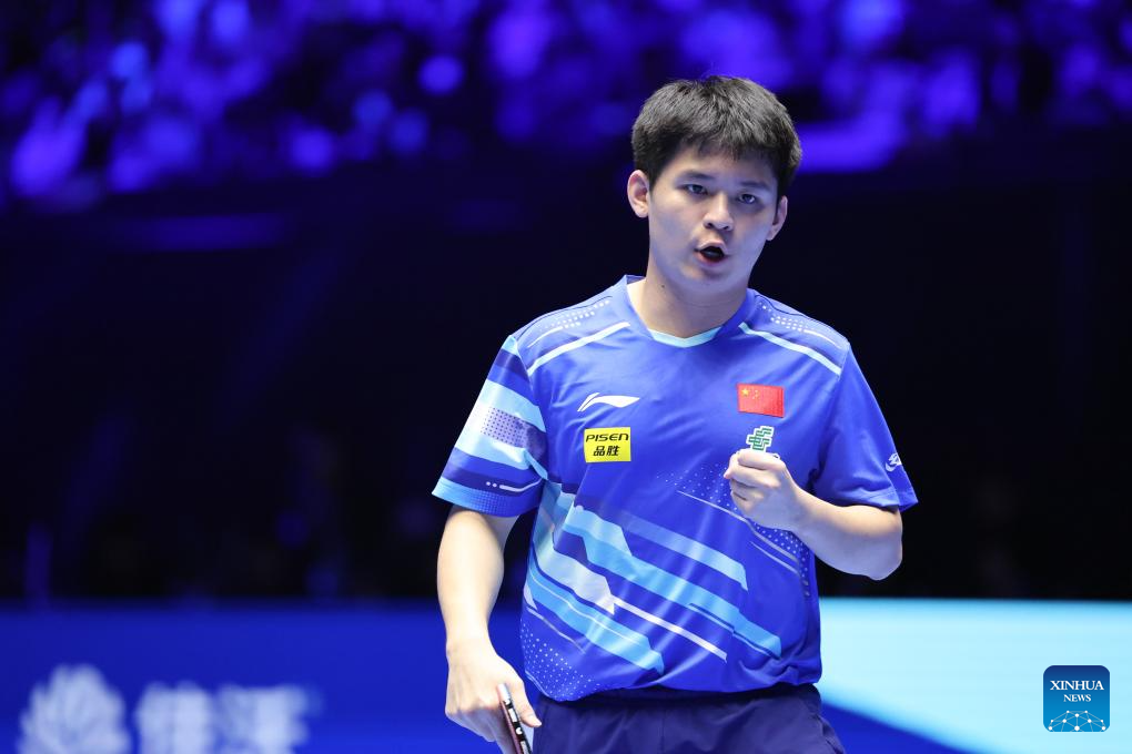 Lin Shidong of China reacts during the men's singles Group 1 match against Wong Chun Ting of China's Hong Kong in Shenzhen, south China's Guangdong Province, Feb. 19, 2025. (Xinhua/Liang Xu)