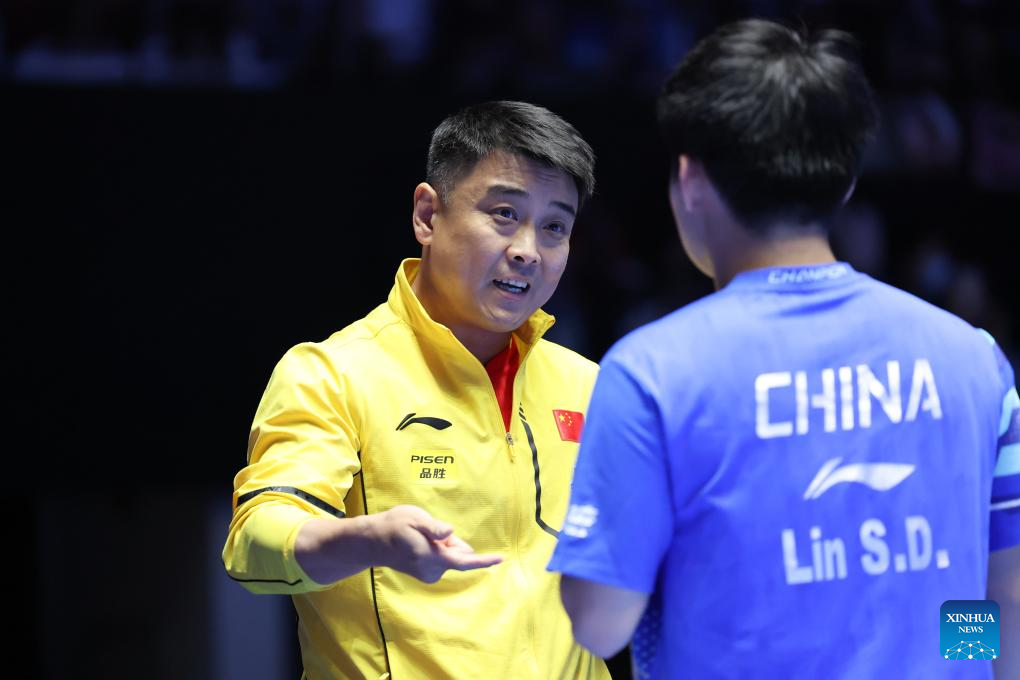 Lin Shidong (R) of China listens to his coach Wang Hao during the men's singles Group 1 match against Wong Chun Ting of China's Hong Kong in Shenzhen, south China's Guangdong Province, Feb. 19, 2025. (Xinhua/Liang Xu)