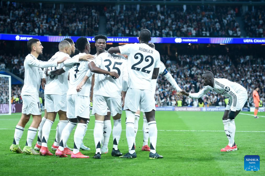 Players of Real Madrid celebrate a goal during the UEFA Champions League knockout phase play-off second leg football match between Real Madrid and Manchester City in Madrid, Spain, on Feb. 19, 2025. (Photo by Gustavo Valiente/Xinhua)