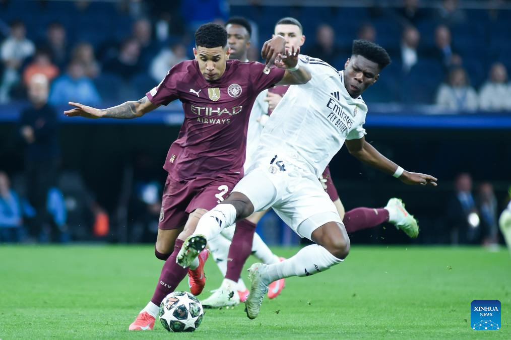 Aurelien Tchouameni (R) of Real Madrid vies with Savinho of Manchester City during the UEFA Champions League knockout phase play-off second leg football match between Real Madrid and Manchester City in Madrid, Spain, on Feb. 19, 2025. (Photo by Gustavo Valiente/Xinhua)