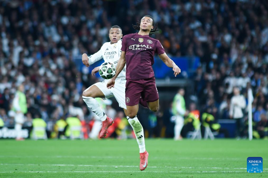 Kylian Mbappe (L) of Real Madrid vies with Nathan Ake of Manchester City during the UEFA Champions League knockout phase play-off second leg football match between Real Madrid and Manchester City in Madrid, Spain, on Feb. 19, 2025. (Photo by Gustavo Valiente/Xinhua)