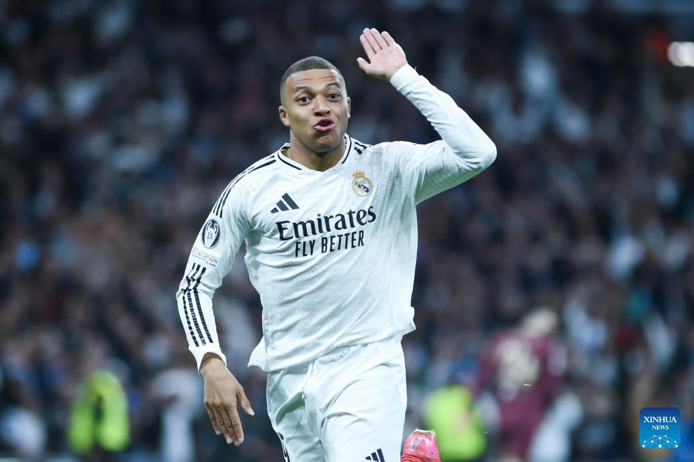 Kylian Mbappe of Real Madrid celebrates a goal during the UEFA Champions League knockout phase play-off second leg football match between Real Madrid and Manchester City in Madrid, Spain, on Feb. 19, 2025. (Photo by Gustavo Valiente/Xinhua)