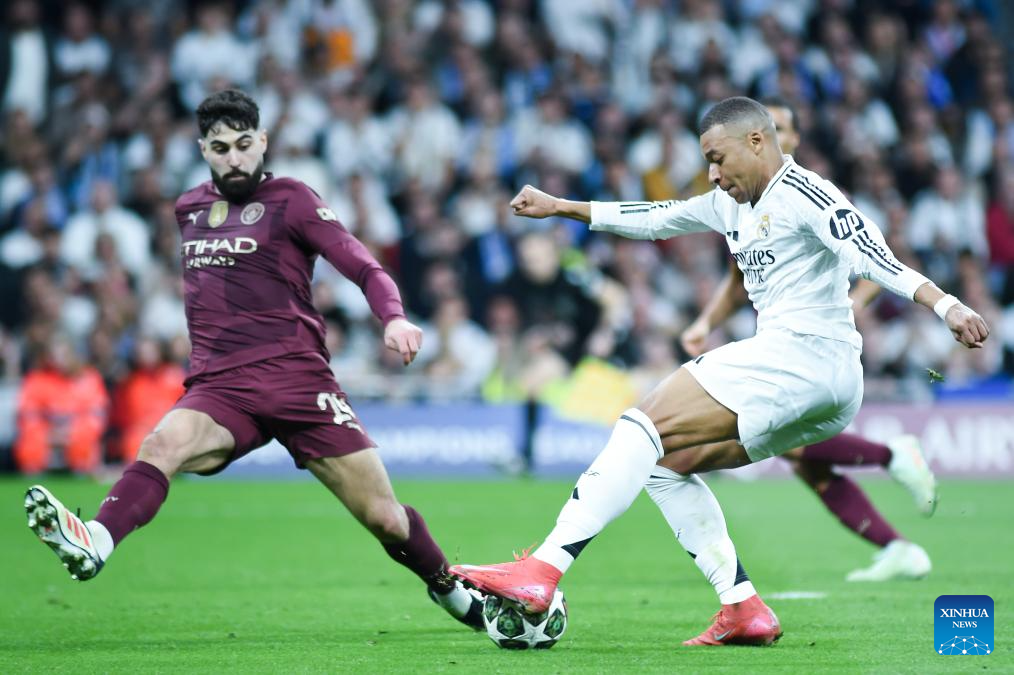 Kylian Mbappe (R) of Real Madrid vies with Josko Gvardiol of Manchester City during the UEFA Champions League knockout phase play-off second leg football match between Real Madrid and Manchester City in Madrid, Spain, on Feb. 19, 2025. (Photo by Gustavo Valiente/Xinhua)