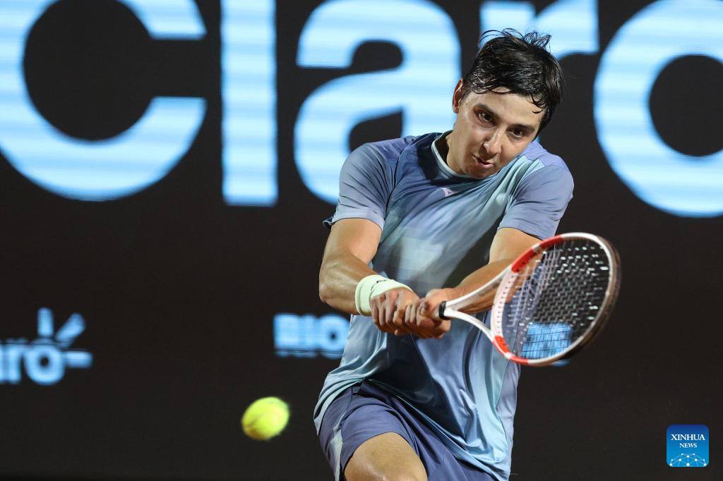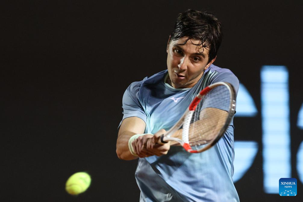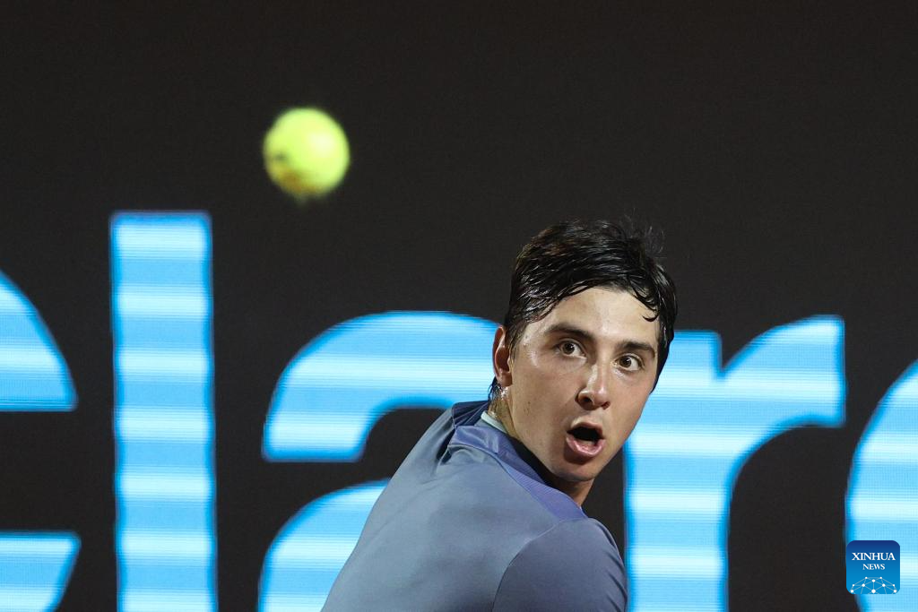 Alexander Shevchenko of Kazakhstan hits a return during the men's singles round of 16 match against Alexander Zverev of Germany at the 2025 ATP 500 Rio Open at Jockey Club Brasileiro in Rio de Janeiro, Brazil, on Feb. 19, 2025. (Photo by Claudia Martini/Xinhua)