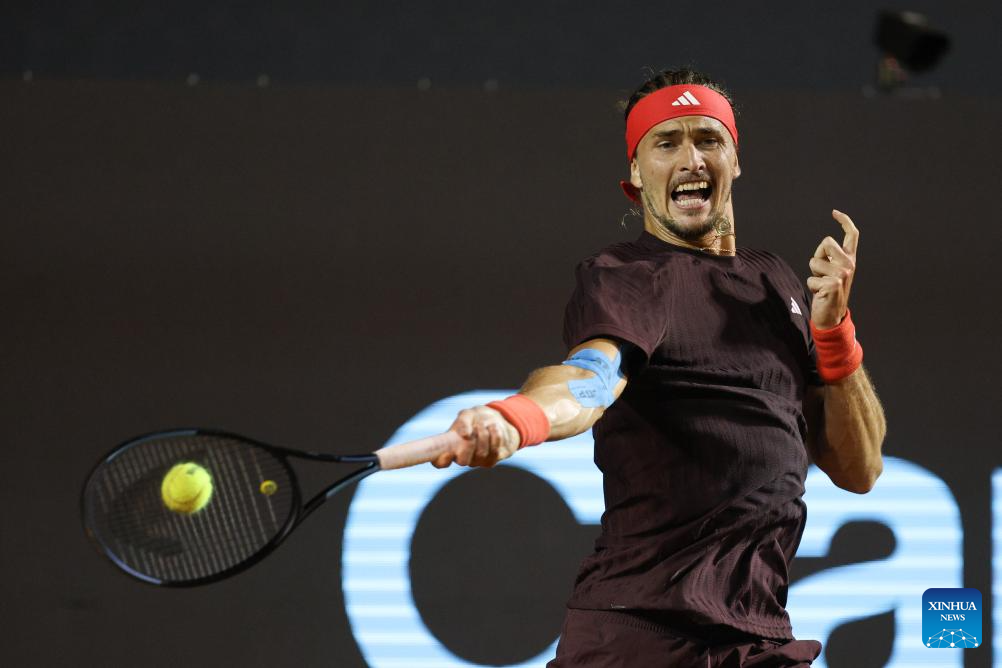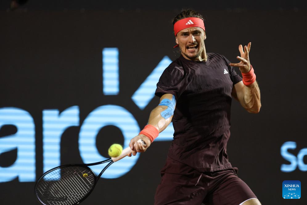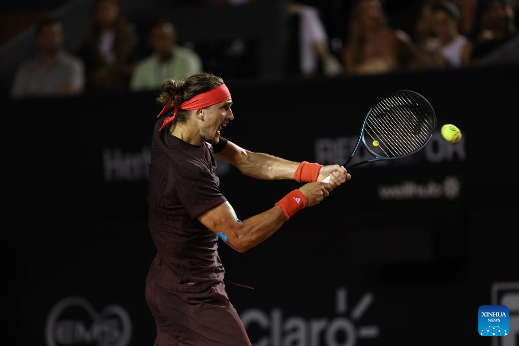 Alexander Zverev of Germany hits a return during the men's singles round of 16 match against Alexander Shevchenko of Kazakhstan at the 2025 ATP 500 Rio Open at Jockey Club Brasileiro in Rio de Janeiro, Brazil, on Feb. 19, 2025. (Photo by Claudia Martini/Xinhua)