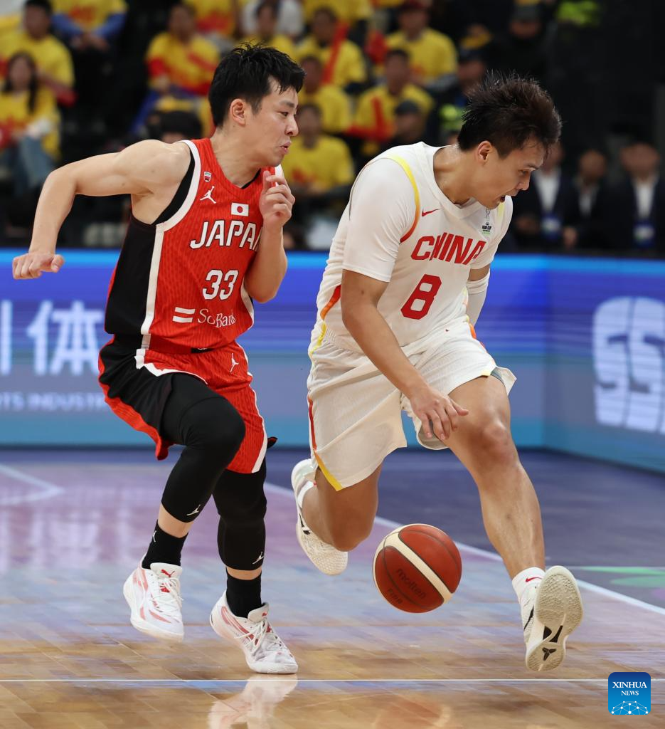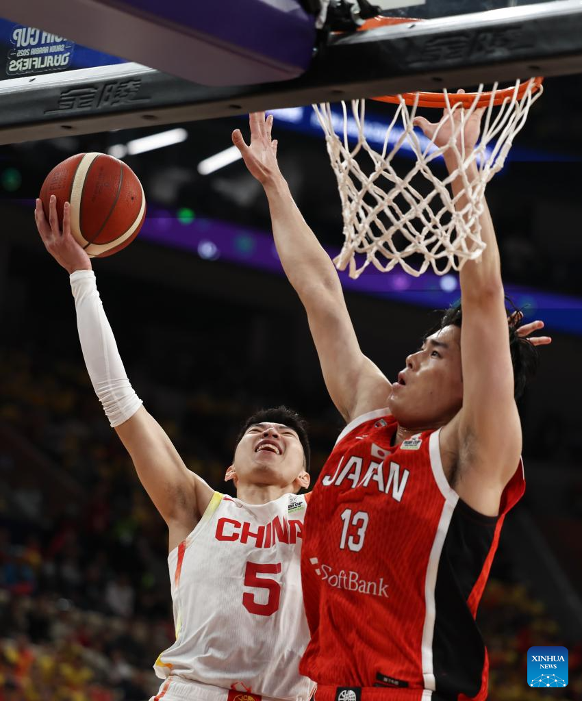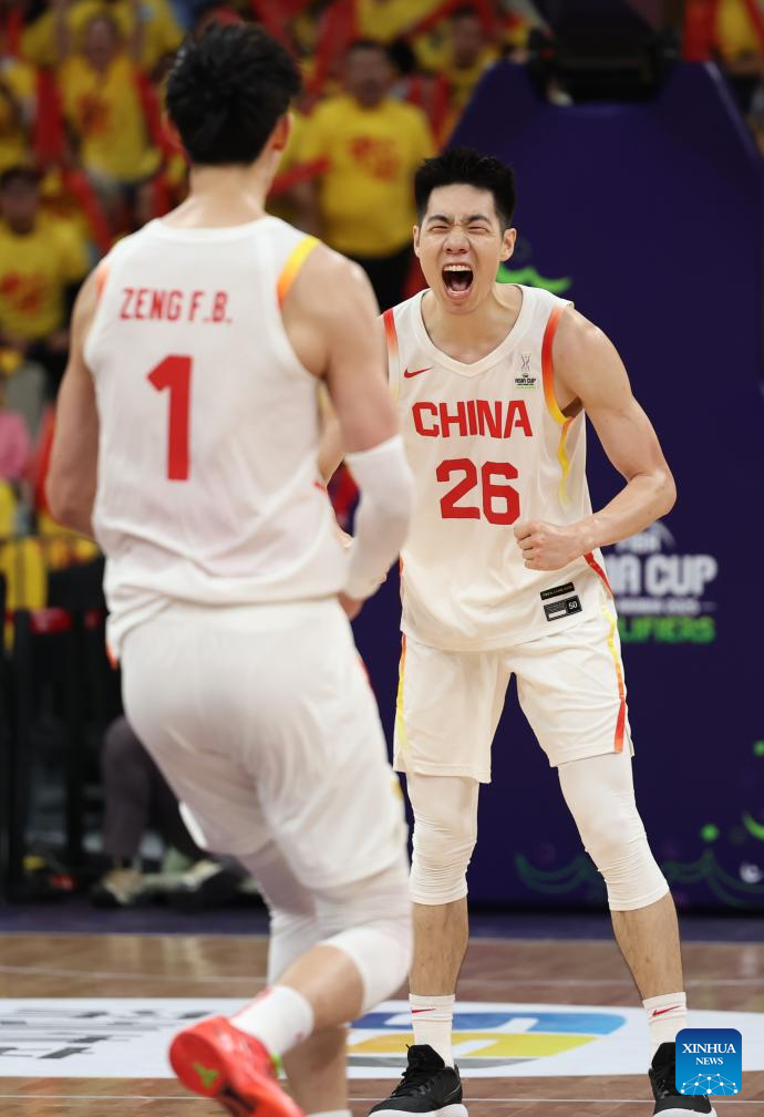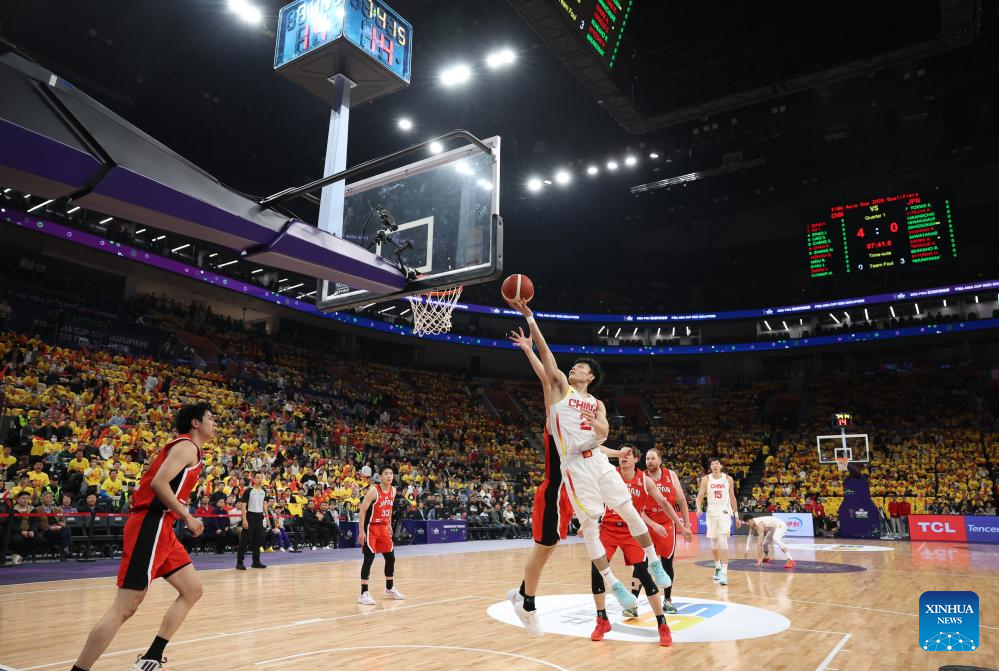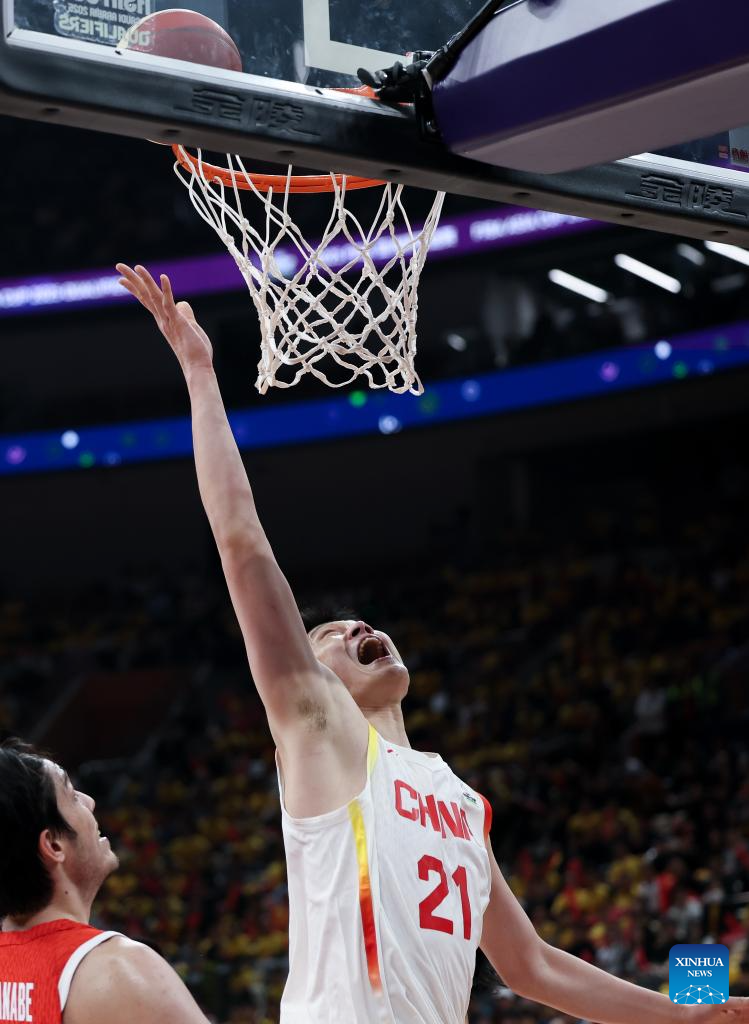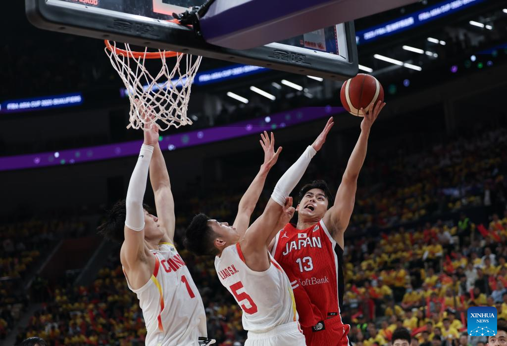 SHENZHEN, Feb. 20 (Xinhua) -- The Chinese men's basketball team won 100-58 over Japan in a Group C game of the 2025 FIBA Asia Cup qualifiers on Thursday evening, securing its place in the Asia Cup.