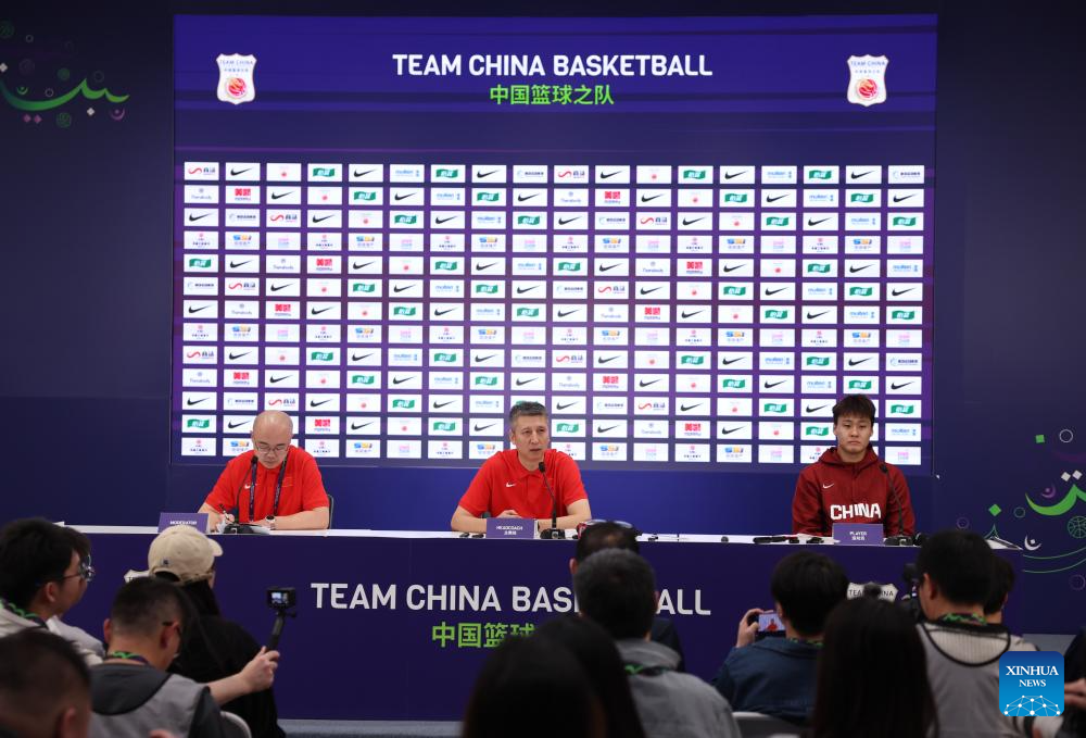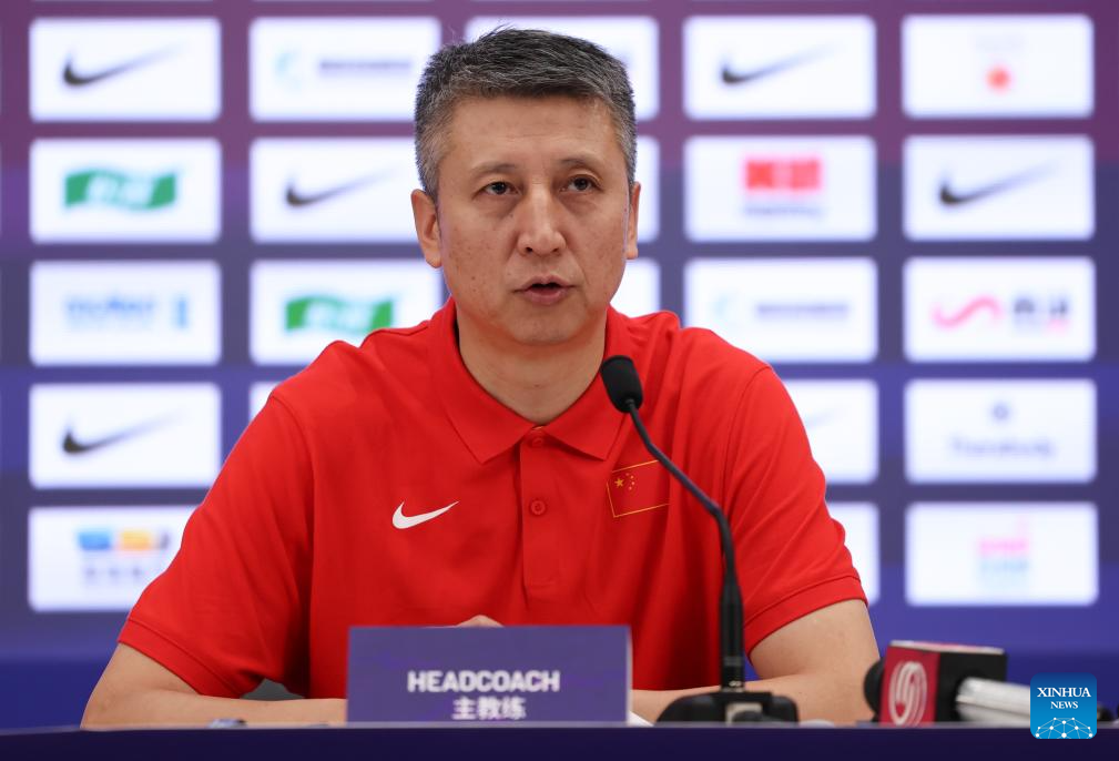 China's head coach Guo Shiqiang attends the press conference after the FIBA Asia Cup 2025 Qualifiers Group C match between China and Japan in Shenzhen, south China's Guangdong Province, Feb. 20, 2025. (Xinhua/Wang Kaiyan)