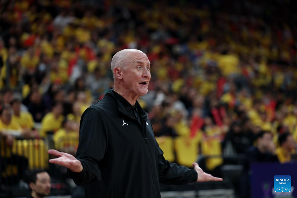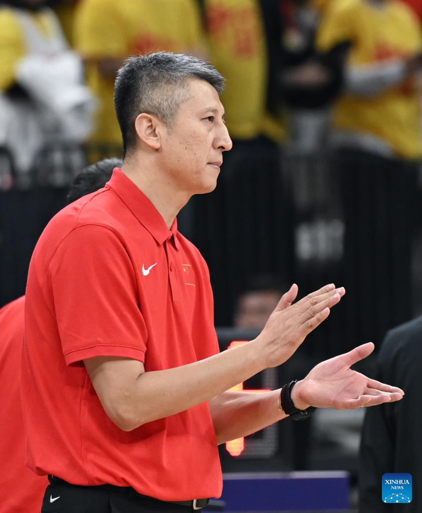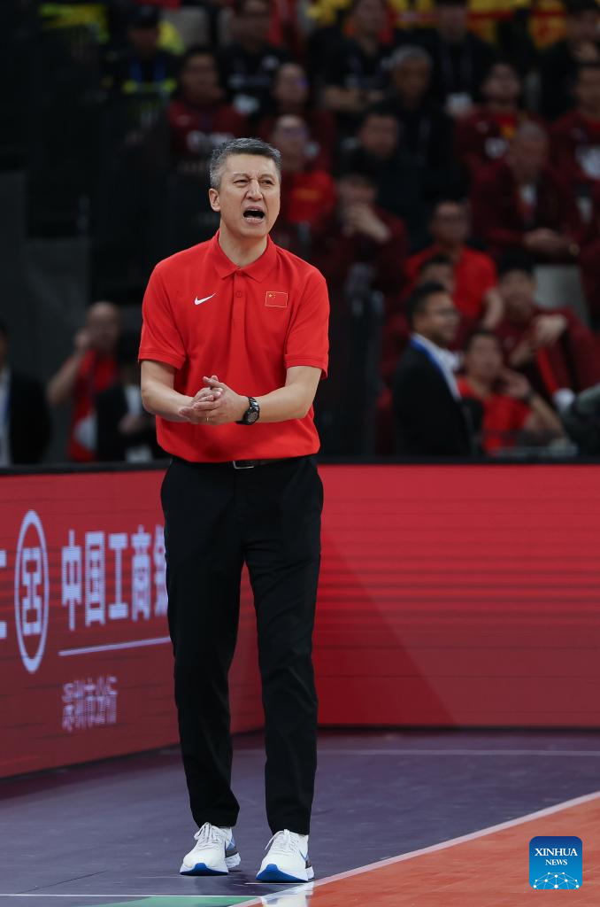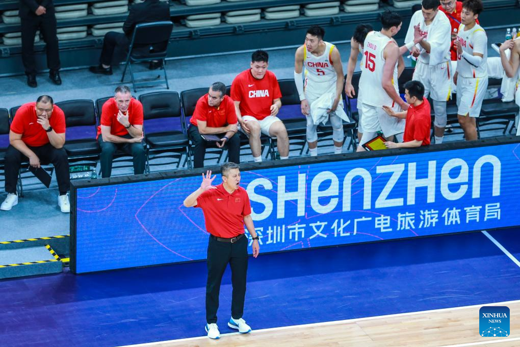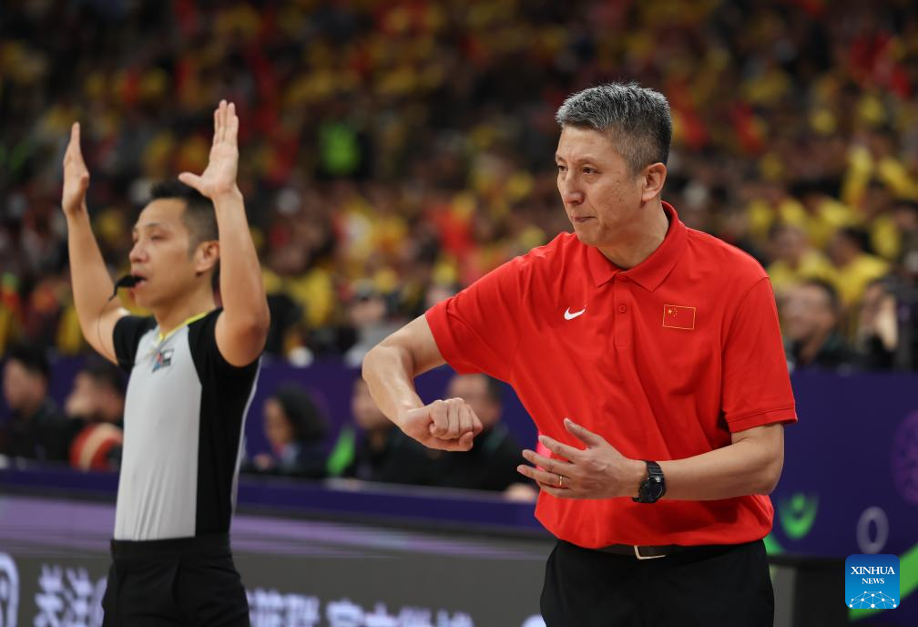 Guo Shiqiang (R), head coach of China, instructs during the FIBA Asia Cup 2025 Qualifiers Group C match between China and Japan in Shenzhen, south China's Guangdong Province, Feb. 20, 2025. (Xinhua/Wang Kaiyan)