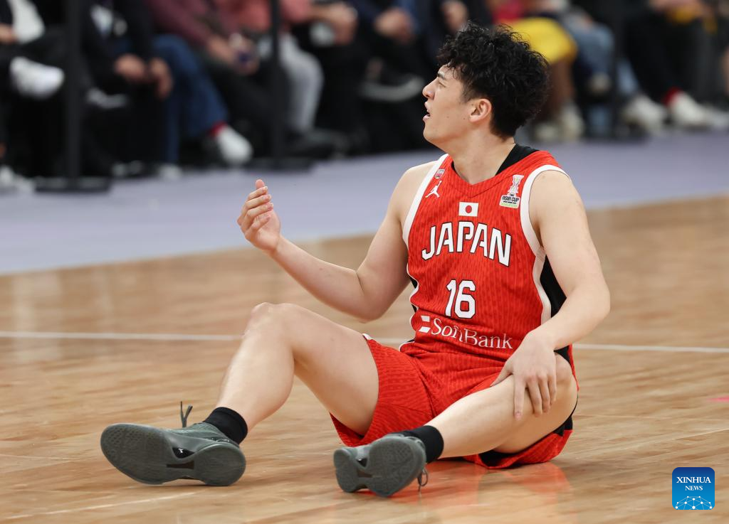 Nakamura Takuto of Japan reacts as he falls down during the FIBA Asia Cup 2025 Qualifiers Group C match between China and Japan in Shenzhen, south China's Guangdong Province, Feb. 20, 2025. (Xinhua/Wang Kaiyan)