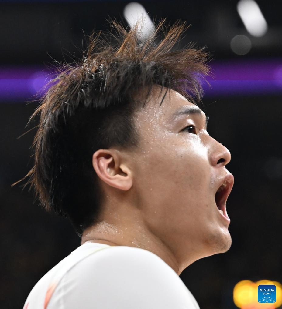 Zhao Rui of China reacts after scoring during the FIBA Asia Cup 2025 Qualifiers Group C match between China and Japan in Shenzhen, south China's Guangdong Province, Feb. 20, 2025. (Xinhua/Deng Hua)