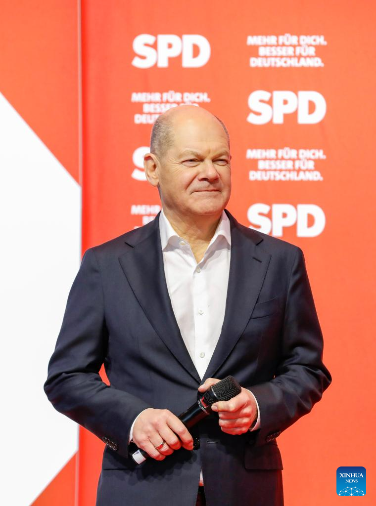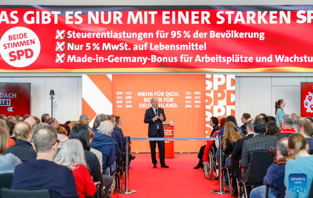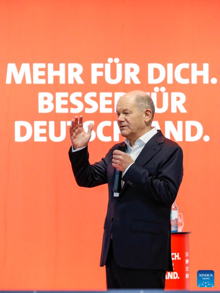 German chancellor Olaf Scholz attends an election campaign in Cologne, Germany, Feb. 21, 2025. (Xinhua/Zhang Fan)