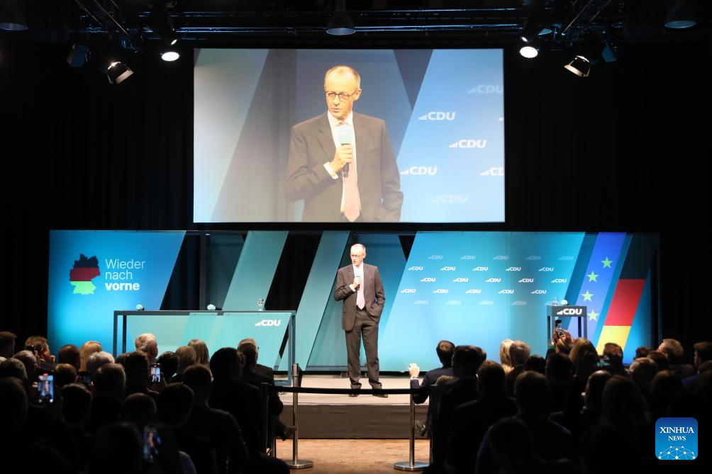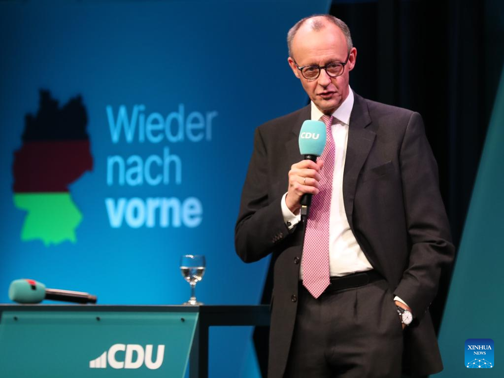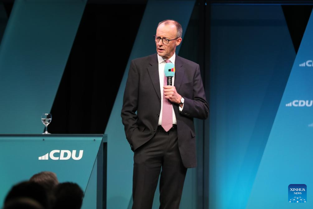 Friedrich Merz, chairman of Germany's Christian Democratic Union (CDU), attends an election campaign in Potsdam, Germany, Feb. 18, 2025. (Xinhua/Du Zheyu)