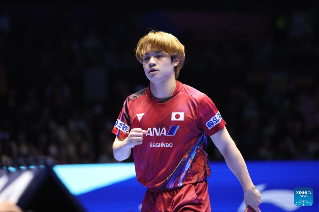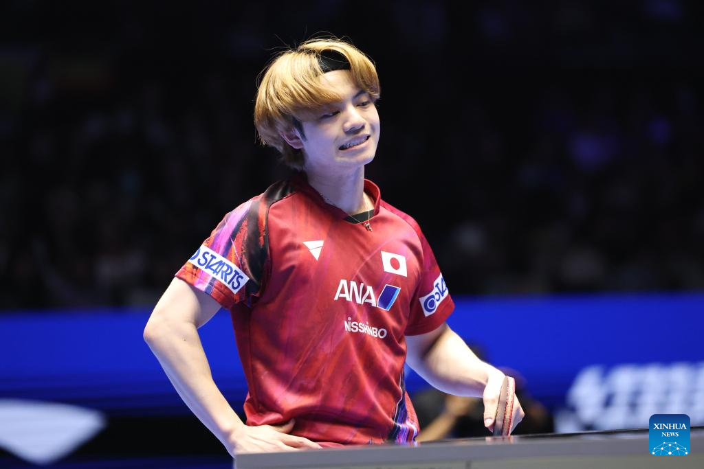 Uda Yukiya reacts during the men's singles quarterfinal between Lin Shidong of China and Uda Yukiya of Japan at the 34th ITTF-ATTU Asian Cup table tennis tournament in Shenzhen, south China's Guangdong Province, Feb. 22, 2025. (Xinhua/Liang Xu)