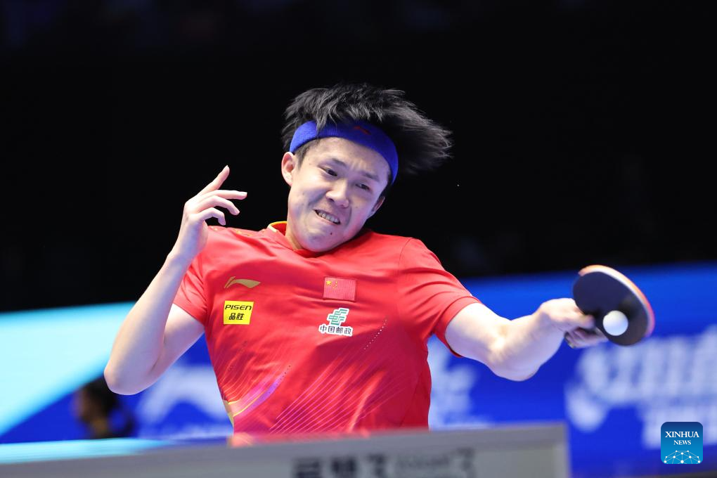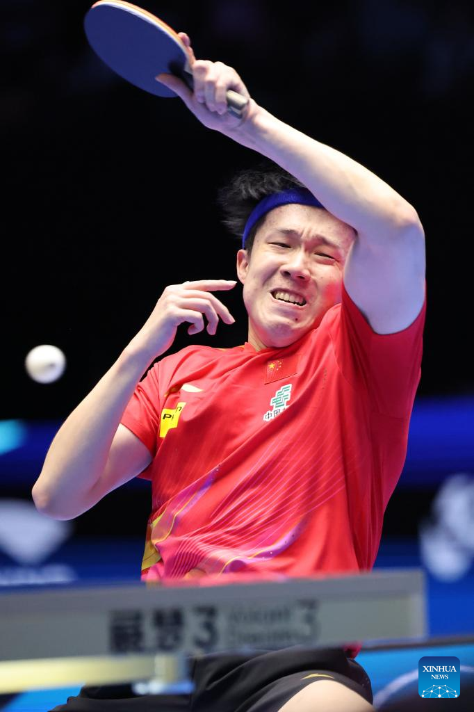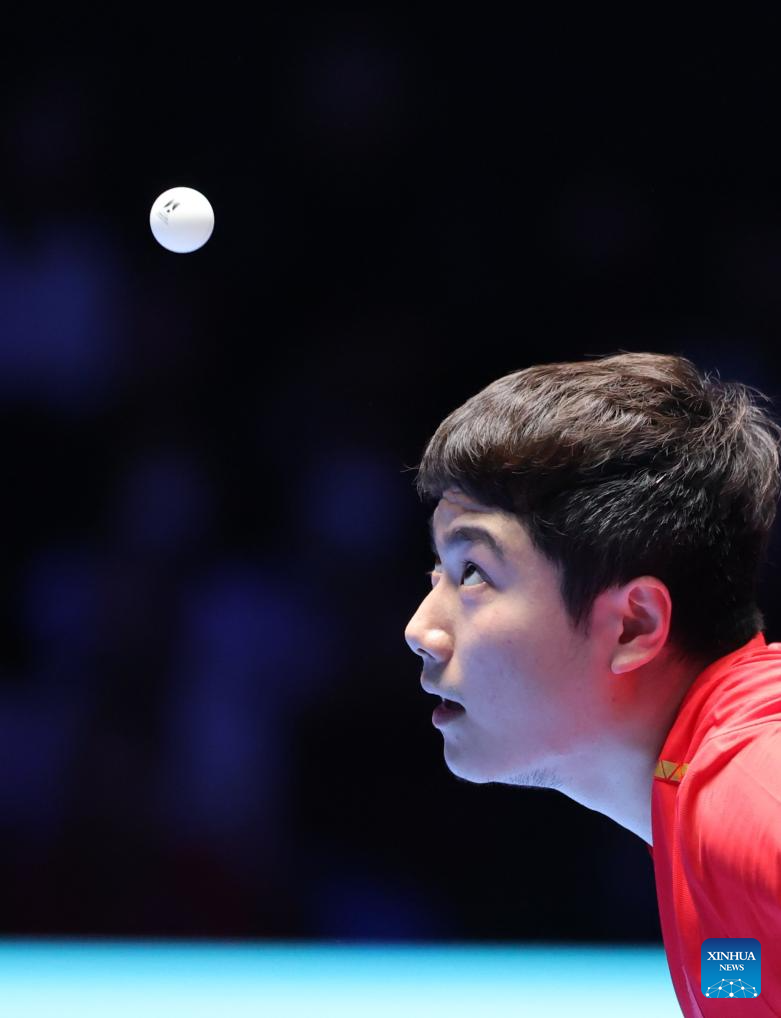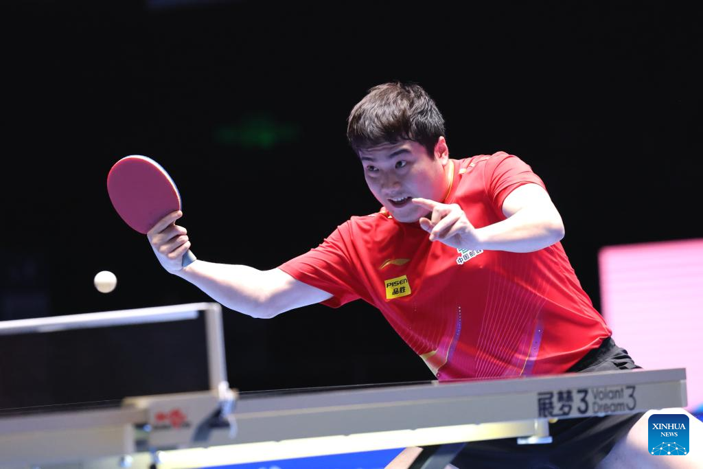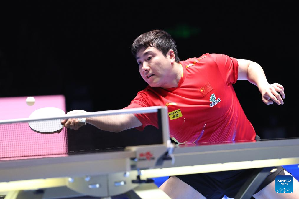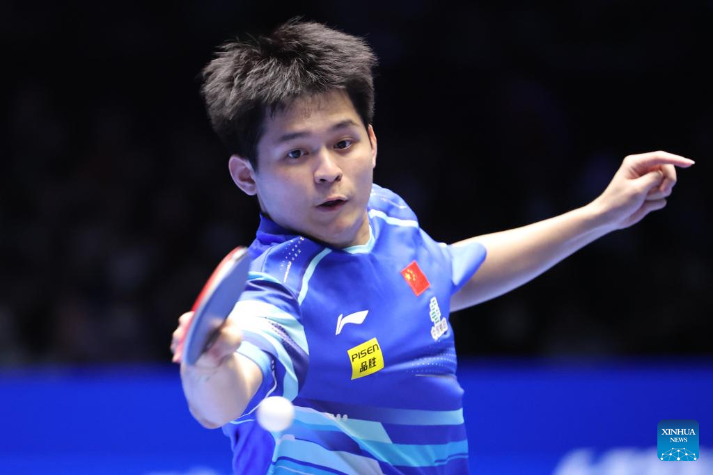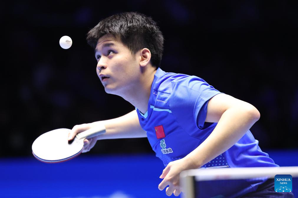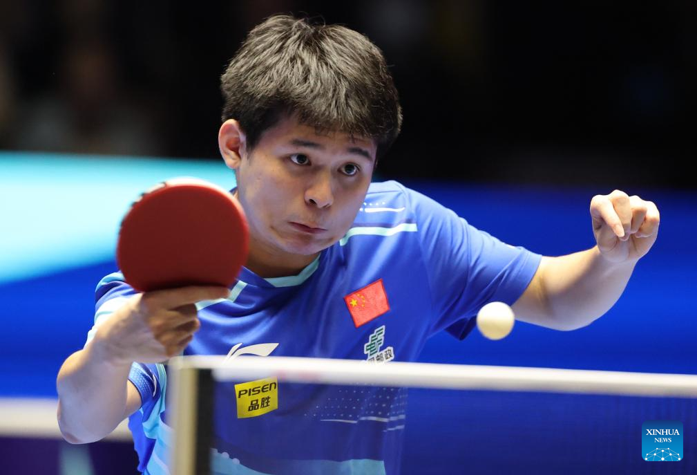 Wang Chuqin of China hits a return during the men's singles quarterfinal against Togami Shunsuke of Japan at the 34th ITTF-ATTU Asian Cup table tennis tournament in Shenzhen, south China's Guangdong Province, Feb. 22, 2025. (Xinhua/Liang Xu)