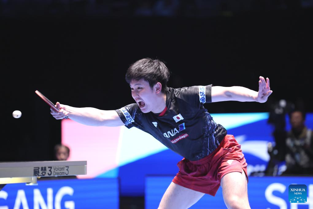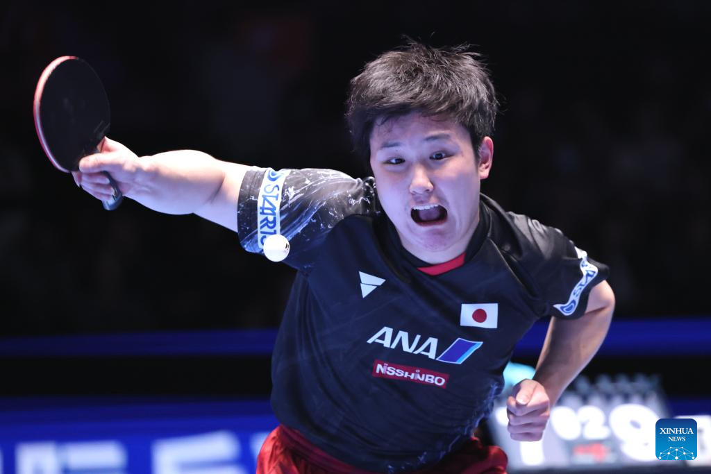 Harimoto Tomokazu of Japan hits a return during the men's singles quarterfinal between Liang Jingkun of China and Harimoto Tomokazu of Japan at the 34th ITTF-ATTU Asian Cup table tennis tournament in Shenzhen, south China's Guangdong Province, Feb. 22, 2025. (Xinhua/Liang Xu)