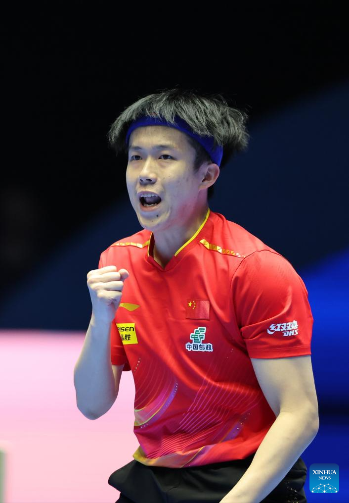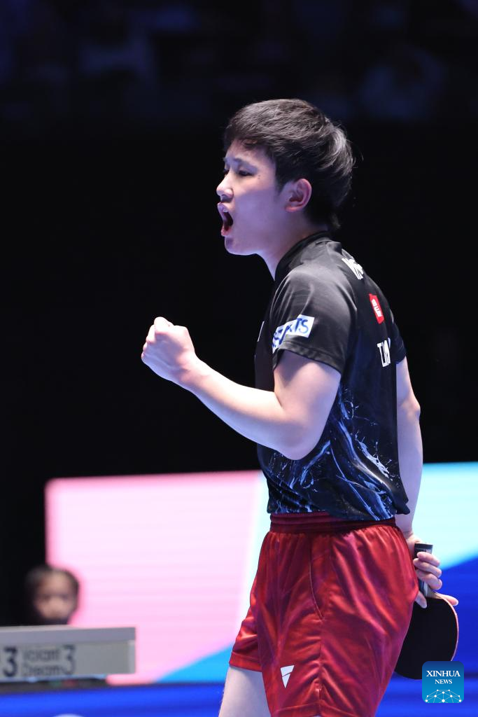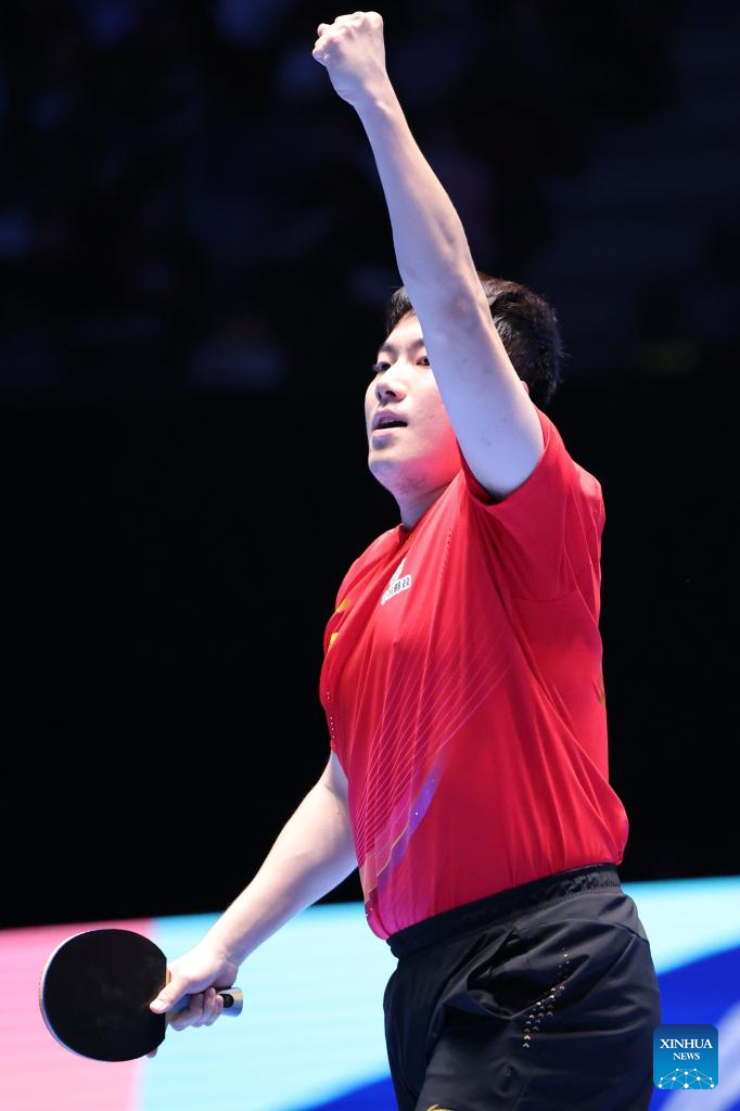 Wang Chuqin of China celebrates scoring during the men's singles quarterfinal against Togami Shunsuke of Japan at the 34th ITTF-ATTU Asian Cup table tennis tournament in Shenzhen, south China's Guangdong Province, Feb. 22, 2025. (Xinhua/Lu Hanxin)
