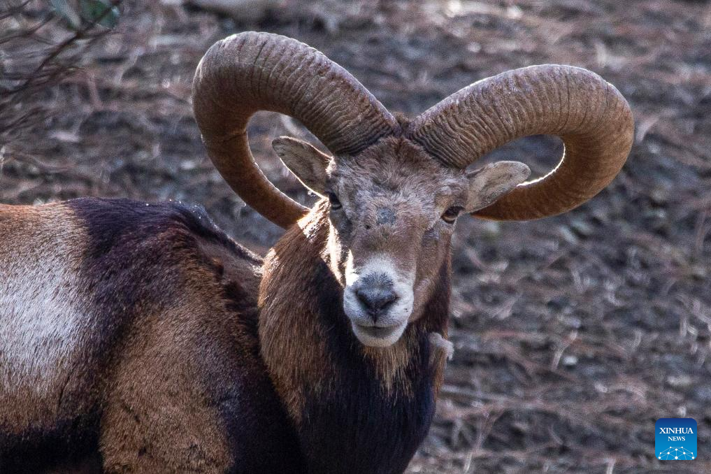 A Cypriot mouflon is seen in Troodos mountains, in Cyprus on Feb. 21, 2025. The Cypriot mouflon, also known as the Cyprus wild sheep, is a rare subspecies in Cyprus. Characterized by reddish-brown fur, a dark dorsal stripe, and curved horns in males, it inhabits the forests and shrub lands of the Troodos Mountains. (Photo by George Christophorou/Xinhua)