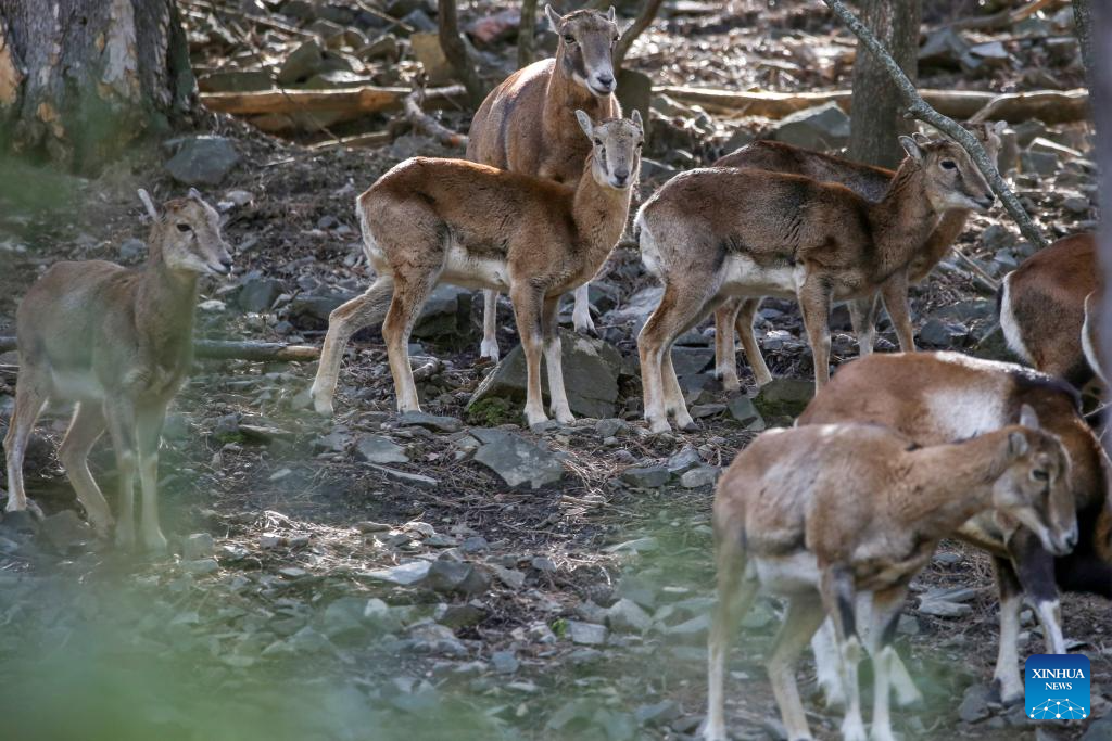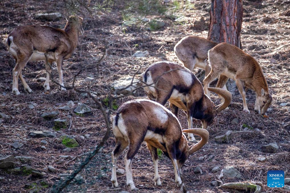 Cypriot mouflons are seen in Troodos mountains, in Cyprus on Feb. 21, 2025. The Cypriot mouflon, also known as the Cyprus wild sheep, is a rare subspecies in Cyprus. Characterized by reddish-brown fur, a dark dorsal stripe, and curved horns in males, it inhabits the forests and shrub lands of the Troodos Mountains. (Photo by George Christophorou/Xinhua)
