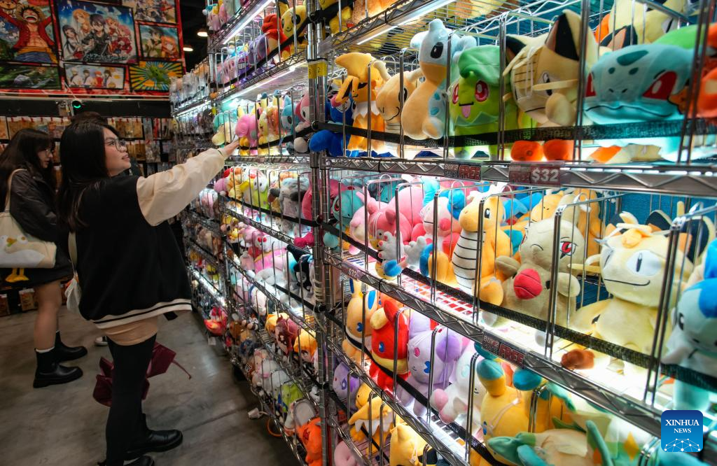 People look at the Pokémon toys during the Fan Expo Vancouver 2025 in Vancouver, British Columbia, Canada, Feb. 21, 2025. As one of the largest comics, sci-fi, anime, and gaming events in Canada, the annual show is held here from Feb. 21 to 23. (Photo by Liang Sen/Xinhua)