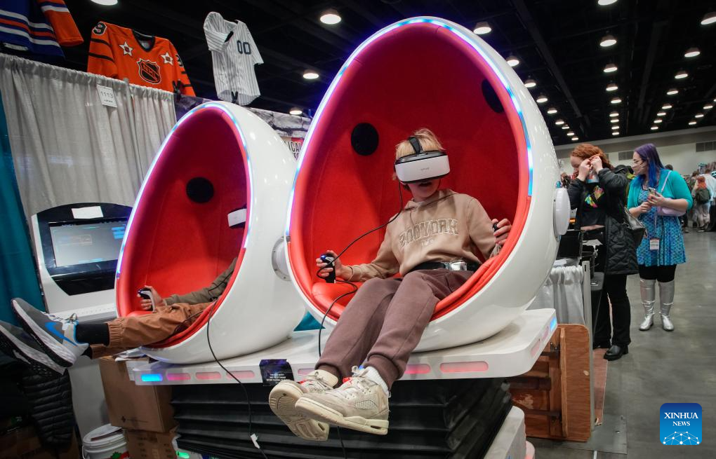 Children participate in a VR game during the Fan Expo Vancouver 2025 in Vancouver, British Columbia, Canada, Feb. 21, 2025. As one of the largest comics, sci-fi, anime, and gaming events in Canada, the annual show is held here from Feb. 21 to 23. (Photo by Liang Sen/Xinhua)