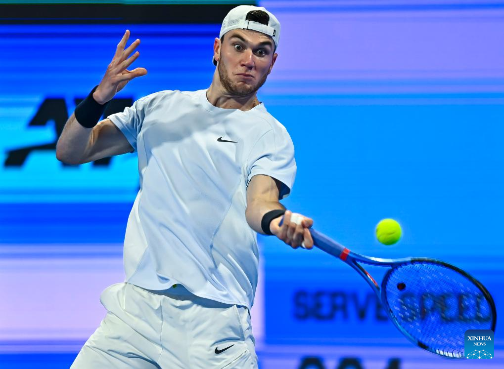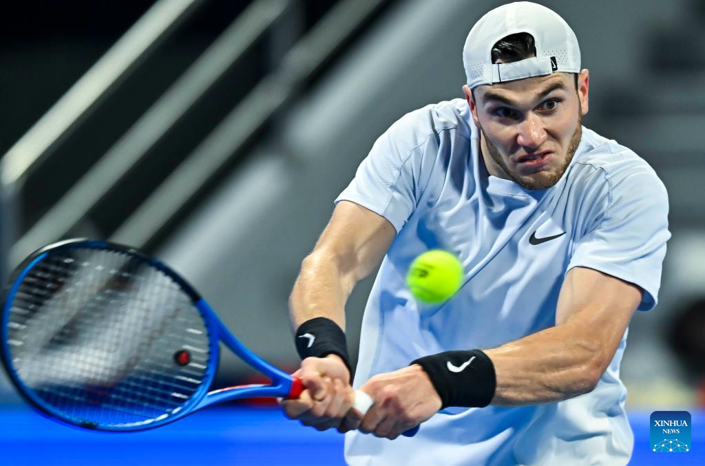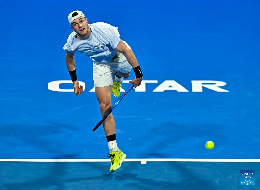 Jack Draper of Britain hits a return during the men's singles semifinal match between Jiri Lehecka of the Czech Republic and Jack Draper of Britain at the ATP Qatar Open tennis tournament in Doha, Qatar, Feb. 21, 2025. (Photo by Nikku/Xinhua)