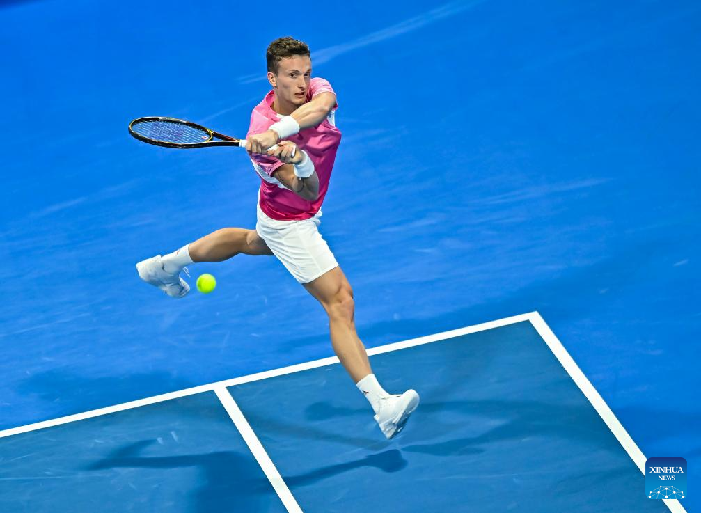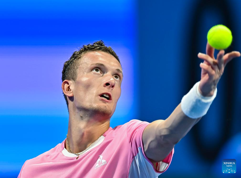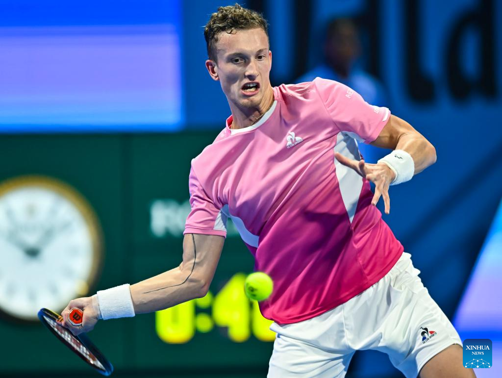 Jiri Lehecka of the Czech Republic hits a return during the men's singles semifinal match between Jiri Lehecka of the Czech Republic and Jack Draper of Britain at the ATP Qatar Open tennis tournament in Doha, Qatar, Feb. 21, 2025. (Photo by Nikku/Xinhua)