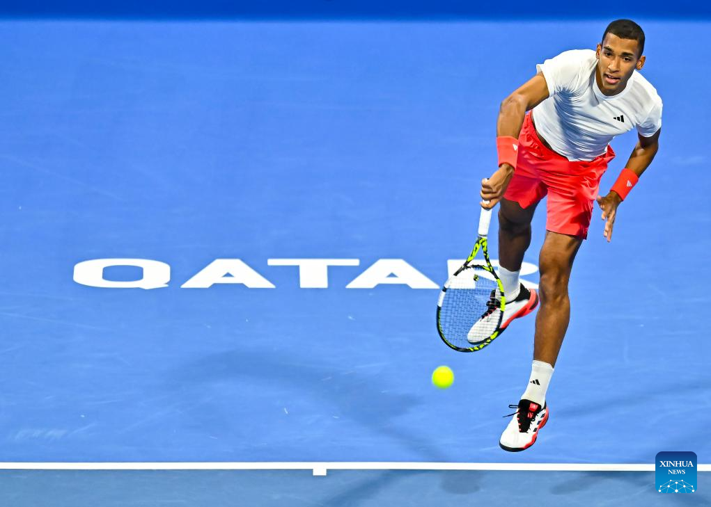 Felix Auger-Aliassime of Canada serves during the men's singles semifinal match against Andrey Rublev of Russia at the ATP Qatar Open tennis tournament in Doha, Qatar, Feb. 21, 2025. (Photo by Nikku/Xinhua)