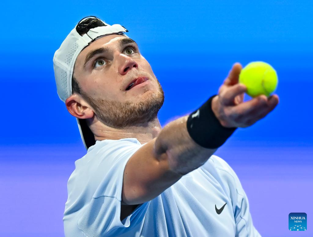 Jack Draper of Britain serves during the men's singles semifinal match between Jiri Lehecka of the Czech Republic and Jack Draper of Britain at the ATP Qatar Open tennis tournament in Doha, Qatar, Feb. 21, 2025. (Photo by Nikku/Xinhua)