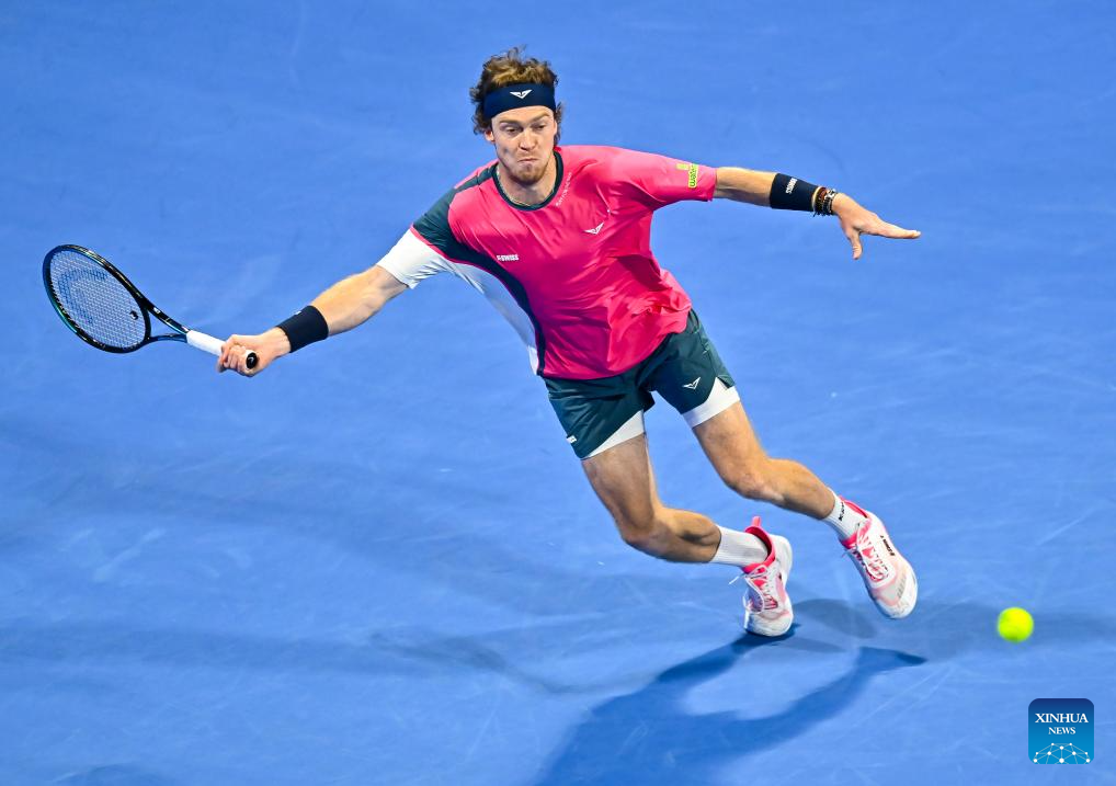 Andrey Rublev of Russia hits a return during the men's singles semifinal match against Felix Auger-Aliassime of Canada at the ATP Qatar Open tennis tournament in Doha, Qatar, Feb. 21, 2025. (Photo by Nikku/Xinhua)