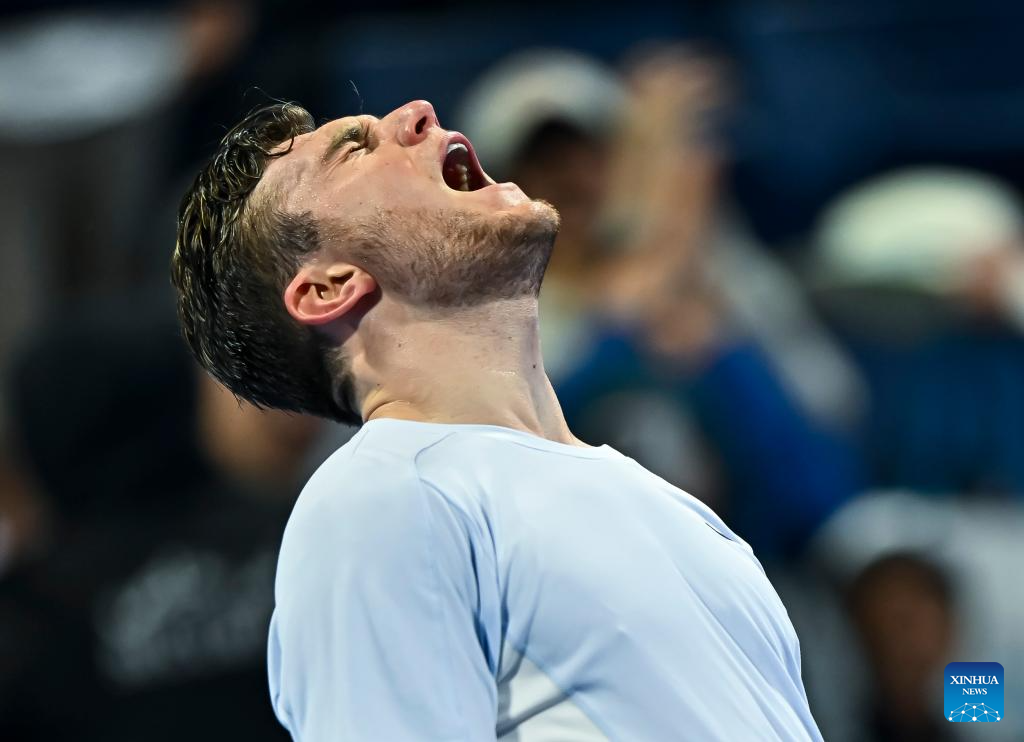 Jack Draper of Britain celebrates after winning the men's singles semifinal match between Jiri Lehecka of the Czech Republic and Jack Draper of Britain at the ATP Qatar Open tennis tournament in Doha, Qatar, Feb. 21, 2025. (Photo by Nikku/Xinhua)