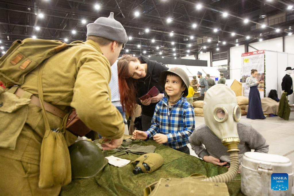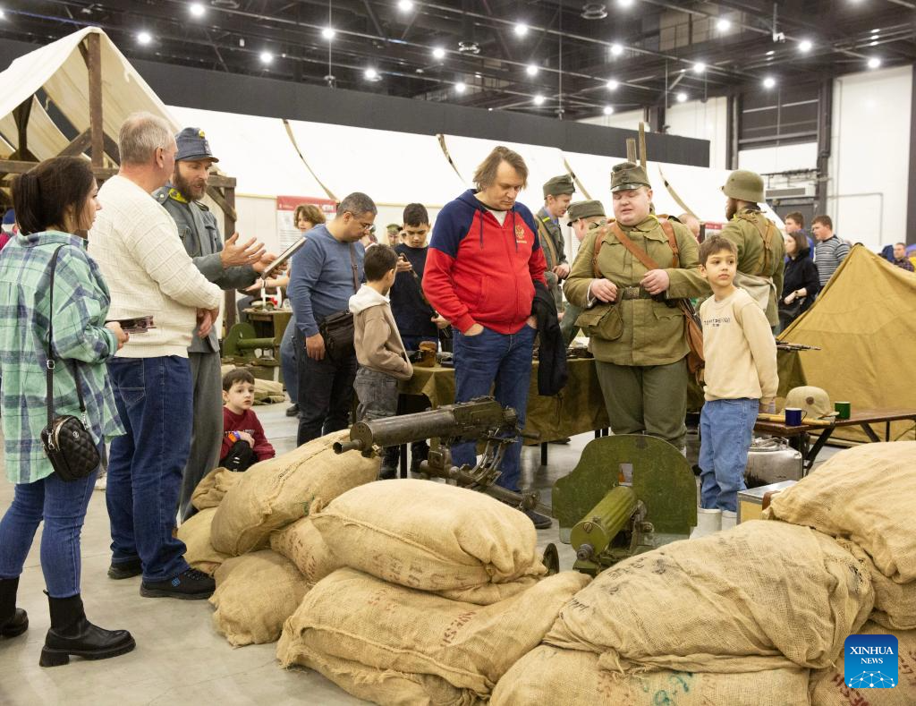 An interactive exhibition on military history was held here on Sunday to commemorate the Defender of the Fatherland Day. The exhibition showed field camps and military equipment models from various historical periods of Russia and re-enacted classic battles. (Photo by Irina Motina/Xinhua)