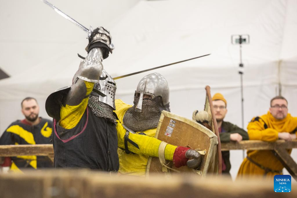 Actors re-enact a medieval battle in St. Petersburg, Russia, on Feb. 23, 2025.
