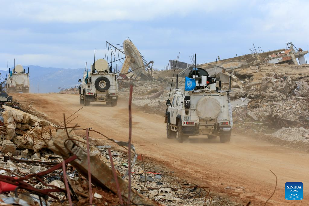 This photo shows United Nations Interim Force in Lebanon (UNIFIL) patrolling in Kafr Kila, Lebanon, Feb. 21, 2025. Kafr Kila is a border village subjected to some of the most systematic Israeli destruction during the clashes between Hezbollah and Israeli forces, which were fueled by the war in Gaza. (Photo by Ali Hashisho/Xinhua)