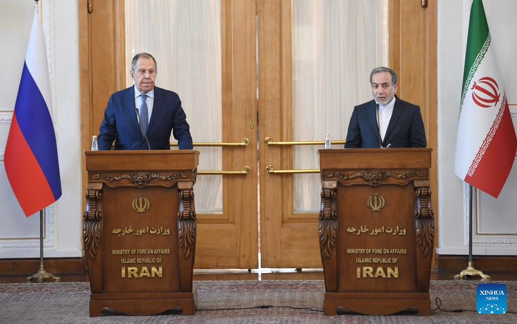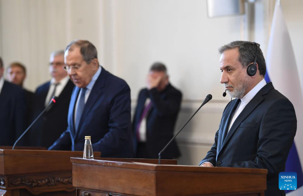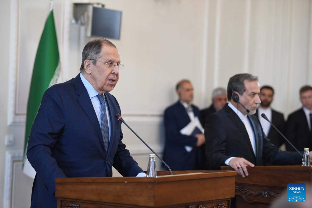Russian Foreign Minister Sergei Lavrov (1st L) and Iranian Foreign Minister Seyed Abbas Araghchi (R, Front) attend a joint press conference in Tehran, Iran, on Feb. 25, 2025. (Xinhua/Shadati)