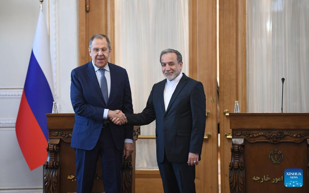 Iranian Foreign Minister Seyed Abbas Araghchi (R) shakes hands with Russian Foreign Minister Sergei Lavrov at a joint press conference in Tehran, Iran, on Feb. 25, 2025. (Xinhua/Shadati)