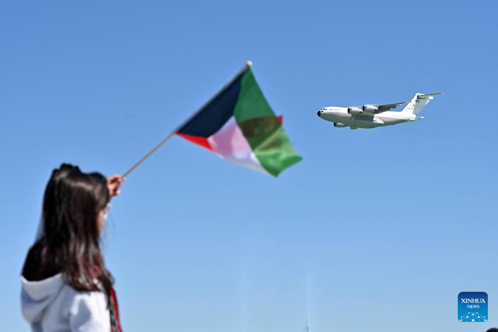 A Kuwaiti Air Force transport aircraft flies in celebration of the Independence Day and the Liberation Day over Kuwait City, Kuwait, on Feb. 25, 2025. (Photo by Asad/Xinhua)