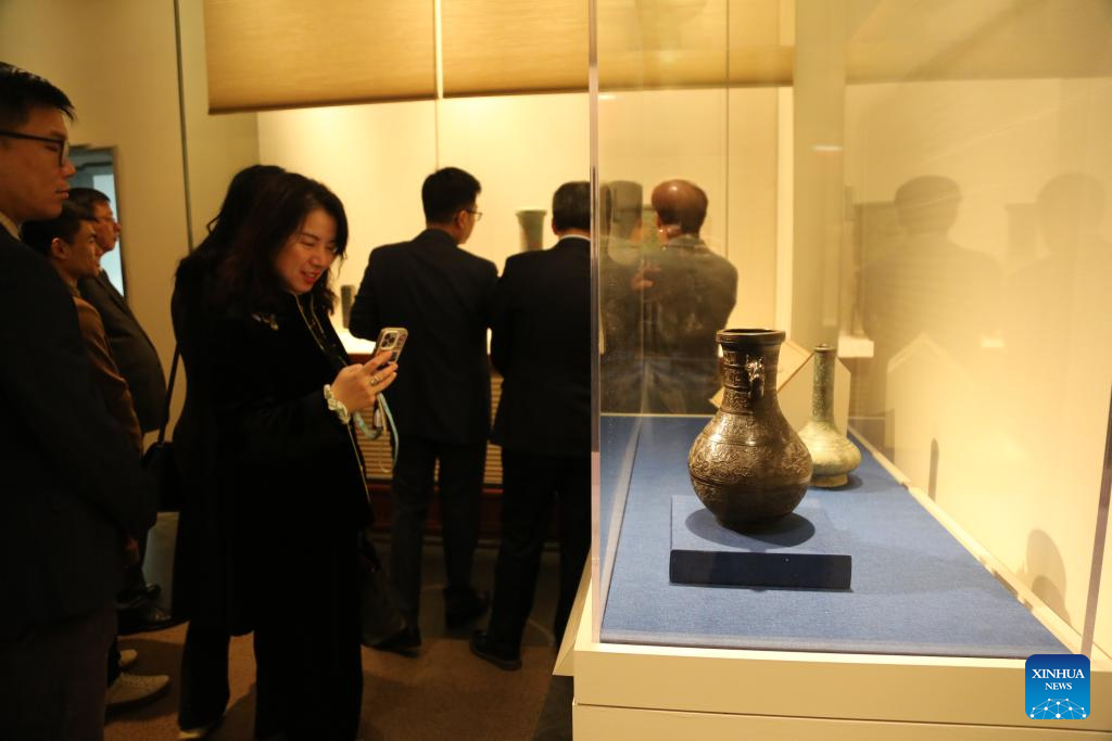 Guests look at a bronze item displayed at the exhibition "Recasting the Past: The Art of Chinese Bronzes, 1100-1900" at the Metropolitan Museum of Art (The Met) in New York, the United States, Feb. 27, 2025. A comprehensive collection of Chinese bronzes from the 12th to 19th centuries is on display in The Met starting Friday for a period of seven months. (Xinhua/Liu Yanan)
