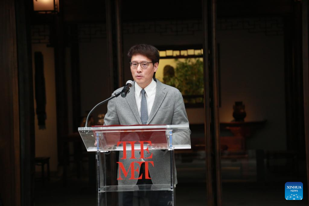 Chu Xiaobo, director of the Shanghai Museum, speaks at a press preview of the exhibition "Recasting the Past: The Art of Chinese Bronzes, 1100-1900" at the Metropolitan Museum of Art (The Met) in New York, the United States, Feb. 27, 2025. A comprehensive collection of Chinese bronzes from the 12th to 19th centuries is on display in The Met starting Friday for a period of seven months. (Xinhua/Liu Yanan)
