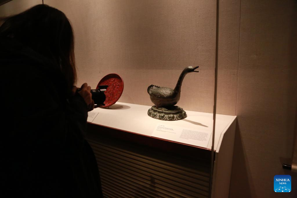 A guest takes photos of an incense burner in the shape of a goose displayed at the exhibition "Recasting the Past: The Art of Chinese Bronzes, 1100-1900" at the Metropolitan Museum of Art (The Met) in New York, the United States, Feb. 27, 2025. A comprehensive collection of Chinese bronzes from the 12th to 19th centuries is on display in The Met starting Friday for a period of seven months. (Xinhua/Liu Yanan)