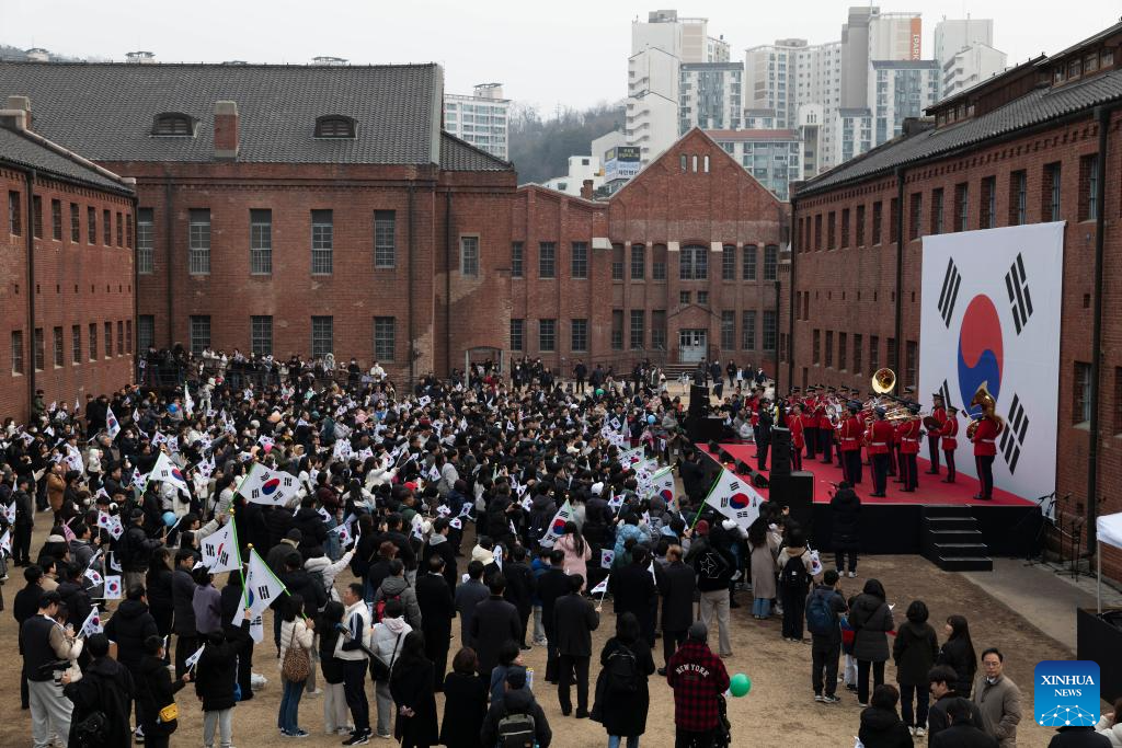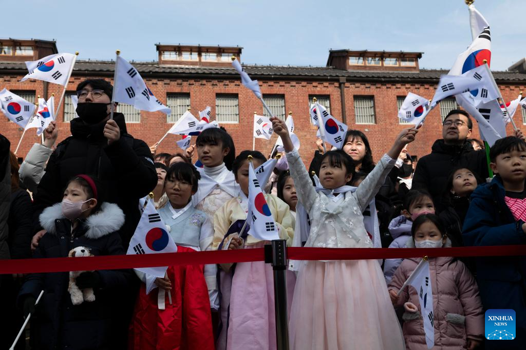 People attend an event marking the 106th anniversary of the 1919 March 1 Independence Movement that took place during the 1910-45 Japanese colonization of the Korean Peninsula, in Seoul, South Korea, March 1, 2025. (Photo by Jun Hyosang/Xinhua)