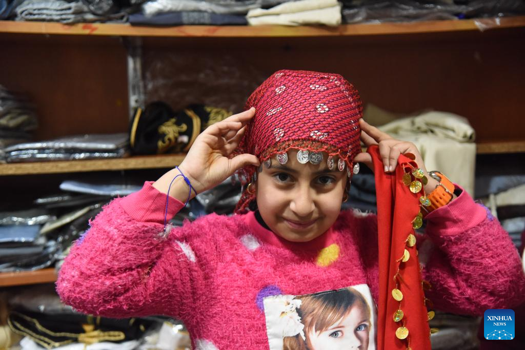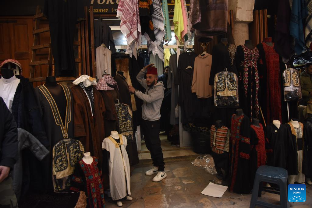 This photo shows traditional clothing on display in Tripoli, Lebanon, on Feb. 28, 2025. People in the northern Lebanese city of Tripoli go to stores and markets, shopping for traditional clothing like robes, embroidered shawls and beautiful head scarves as the holy month of Ramadan approaches. (Photo by Khaled Habashiti/Xinhua)