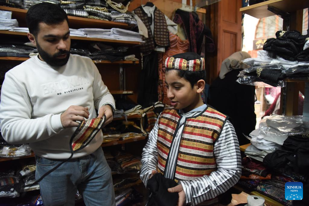 Customers shop for traditional clothing in Tripoli, Lebanon, on Feb. 28, 2025. People in the northern Lebanese city of Tripoli go to stores and markets, shopping for traditional clothing like robes, embroidered shawls and beautiful head scarves as the holy month of Ramadan approaches. (Photo by Khaled Habashiti/Xinhua)