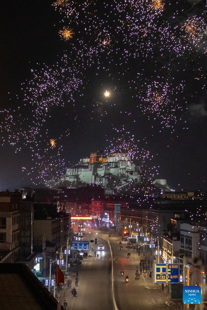 An aerial drone photo taken on Feb. 27, 2025 shows fireworks illuminating the sky on the "Gutu Eve" in Lhasa, southwest China's Xizang Autonomous Region. On the traditional "Gutu Eve", families gathered together to have a feast of "gutu", a traditional soup dish made of flour. Fireworks and sparklers popped, glittered, and lit up the sky over Lhasa in celebration of the Tibetan new year. (Xinhua/Jiang Fan)