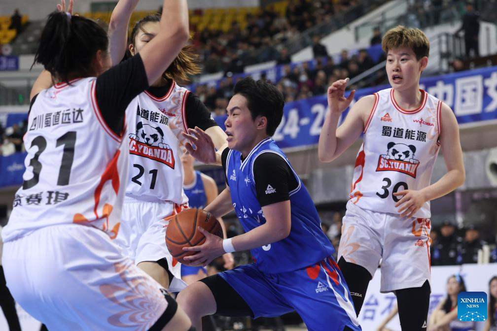 Zhou Yueming (2nd R) of Heilongjiang competes during the 1st round match between Heilongjiang and Sichuan of the 2024-2025 season Women's Chinese Basketball Association (WCBA) league playoff in Daqing City, northeast China's Heilongjiang Province, Feb. 28, 2025. (Xinhua/Zhang Tao)